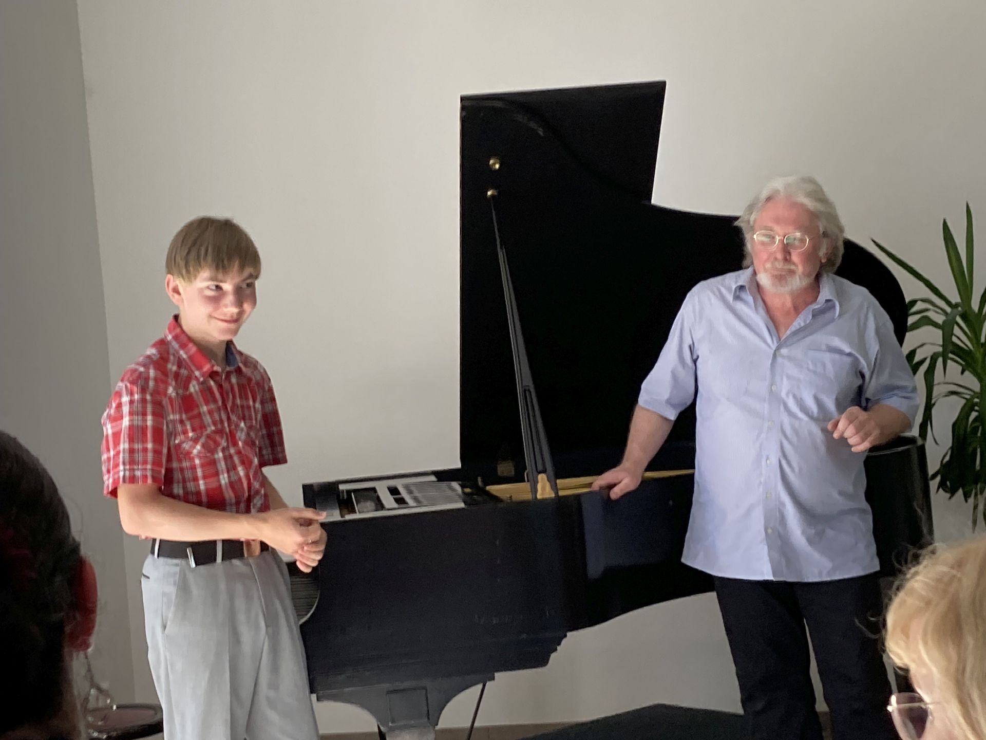 „Mir macht das Klavierspiel schon immer Freude“, sagt er stolz zu Beginn seines ersten Solo-Konzertes. Zehn Stücke hatte er vorbereitet – und bemerkenswert sicher und gefühlvoll interpretiert. Angeleitet von seinem Klavierlehrer Stephan Naumovich interpretierte er u.a. Werke von Ludwig van Beethoven („Für Elise“) bis Antonio Vivaldi („Winter“), aber auch Filmmusik von Ludovico Einaudi („Experience“, „Nuvole Bianche“) oder von Klaus Doldinger („Das Boot“). „Wenn Rafael so fleißig weiter spielt,“ dankte sein Lehrer ihm nach dem Konzert und sprach begeistert: „Dann können wir uns auch an Johannes Brahms u.a. romantische Klaviermusik wagen.“